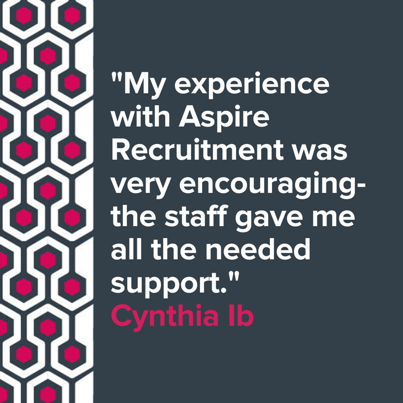“My experience with Aspire Recruitment was very encouraging- the staff gave me all the support I needed. They even went as far as briefing me on what to expect during interviews. I was supported all throughout the process. I have always recommended people to Aspire Recruitment and I will continue to do so- the staff are friendly and are always patient, willing to help no matter the situation. I would like to give a shout out to Frank. He has been very supportive, calm and patient. I admire his customer service skills- no matter how many times you call him, he will answer, and will take his time to explain things to you.”